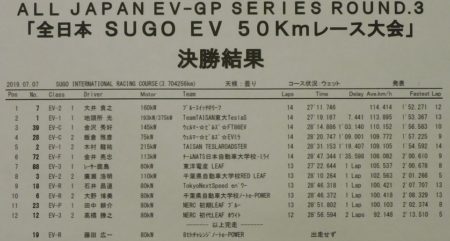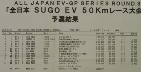 レースがあった7月7日(日、七夕)のスポーツランド菅生は上着が欲しくなる気温16℃から18℃で路面温度が低く、小雨ベースで時々やむこともあるためラインを外すと激しく滑るという難しいコンディションでありました。おまけにEVレースは決勝に備えバッテリーの温度上昇を抑えるために予選は計測1周だけで済ませたいと、この日は特殊な状況になりました。