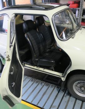 ただシート位置さえ少し後方にズラしてやれば、けっこう余裕で運転できそうな雰囲気。また、ダンパーはコニが付いていた。スバル360の定番なのだという。ノーマルダンパーあるか聞いたら「残ってます」。これまた喜多見さんにチェックしてもらわなくちゃ。コニで「スバル・クッション」と言われた超滑らかな猫足になるのか気になるところ。