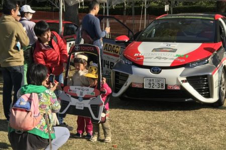今回、私のミライを展示させて欲しいというので喜んで使って貰った。すると下のような記念撮影の小道具など用意。ミライや燃料電池の開発担当の人達が丁寧に対応している。聞けば「競技車両は華やかなので皆さん興味を持って話を聞いてくれます」。プラス指向ですね。