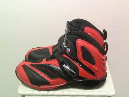 普通のブーツっぽい靴でやろうと思っていましたが、両ブレーンから「イザという時のためにアキレス腱が隠れるハイカットを」、「普通の靴はギアチェンジで左側が極端にボロくなる」という進言があり、お買い上げ。銘柄は10代の時にバイクとは全く関係なく安かったので買ったエルフのバイク用の靴が、ギアチェンジのために紐の部分にカバーしてあるのに感銘を受けたことがあり、エルフに決定(もっともフランスで作っている訳でもありませんが)。値段と靴の高さとの折り合いなどで、この商品を選びました。