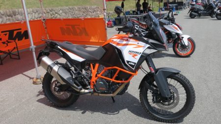 最後は『1290スーパーアドベンチャー』(写真はR)。最近世界規模で人気の大型デュアルパーパスバイク。私のスズキVストロームと同じジャンルです。KTMの凄さは軽くてパワフルなこと。ライバルより70kgくらい軽い215kgしかなく、そいつに160馬力(!)というツアラーとしちゃ強力なエンジン積む。