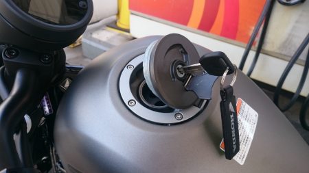 左側面のキーシリンダーにキーを入れエンジンを掛けると、単気筒ながらちょっとだけハーレーのVツイン的な「テケテケ、ビダビダ」に近い音がすることに気づきます。ド素人にはちょっとエンストしそうな不安もありますが、クルーザーらしい演出として歓迎できます。