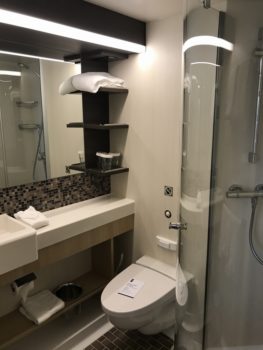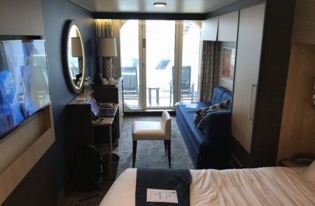 部屋は『7320』という7階の船体が凹んだロケーションでバルコニーに出ると目の前は救命ボート。普通なら安いです。乗船料は公式サイトの価格表を見たら定価で払っている。どこかで抜かれてます。部屋の作りは一般的なクルーズ船と同じ。平均よりシャワールームが広く、収納スペース豊富。TVも液晶の大画面で快適だ。部屋担当のサービスマンも親切で好ましかった。