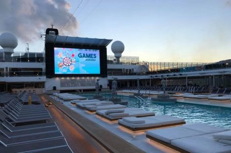 中にいるとフネだということを忘れてしまう、と言いたいところながら、メラビリアは微妙に揺れ続けていて、座るとフネだと認識する。今まで300m級のフネを3回取材したが、それほど荒れていないのに揺れると感じたのはメラビアリアのみ。もしかすると艇体(ハル)が長い周期で振動してる?