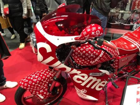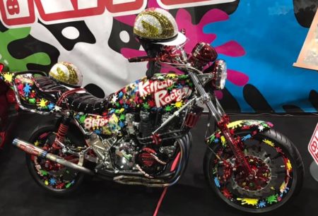 バイクにも度肝を抜かれた。ミラーまでLVマーク! パンチ効いてますね~! このショップのバイクの塗装&仕上がりは素晴らしい。昨年もしばし魅入ってしまいました。バイクファンが予想以上に多く、いつも人だかり。飾りモノにしていいレベルです。2つ下の派手派手バイクも同じショップの”作品”だ。力作である。