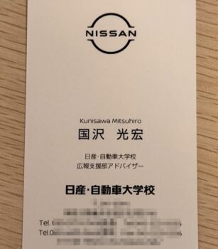 こんな名刺をもらってしまった! 日産が今の騒動になる前の2023年のこと。日産自動車大学校の広報担当の人から「整備士になろうという人が減っていて困ってます。コロナ渦までは海外から学生もきていましたけれど、急減。何かアイデア無いでしょうか?」。なんせ全日本安請け合い連盟上級会員。困っている人から相談されると「何とかならんか」と思ってしまう。