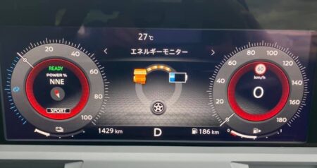 エンジン停止状態でアクセル全開すると、直後に60%まで上がる。100%を136馬力だとすれば82馬力に相当する。つまり長い時間出せるモーター出力は54馬力ながら、短時間なら82馬力引き出しているということ。1.5倍のブーストパワーなのだった。1秒少々でエンジン始動し、2秒以内に100%の136馬力に達するため、オーバーブーストは1秒~1.5秒くらいか?