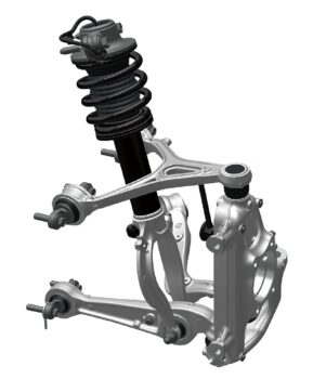 ピロボールって何だか知ってんのかな? そもそもサスペンションには必ずアームが付いている。オーソドックなWウィッシュボーンなら上に2箇所。下に2箇所の車体接合部を持たせ、タイヤが車体と並行に上下するようになっている(上の写真のAアームを長く伸ばすとフォーミュラカーのようになって解りやすいと思う)。車体接合部のアーム、ボルトで締めると動かなくなります(笑)。