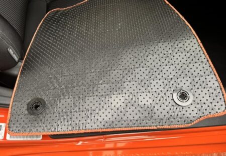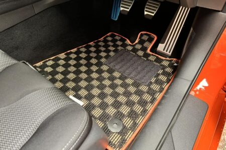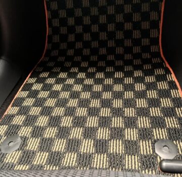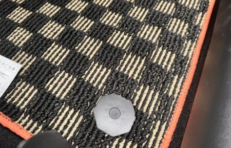 ということでフロアマットはアフターマーケットを選ぶ。純正だと2万6000円くらいするが(2枚なので安い)、アフターマケットなら5000~1万円程度。今回は車体と同じオレンジのステッチとチェッカー柄で決めました。送料込み7590円なり。純正の3分の1だ。皆さんアフターマーケットのフロアマットというと床に置くだけだと思っているらしい。