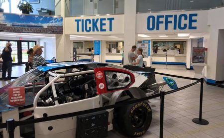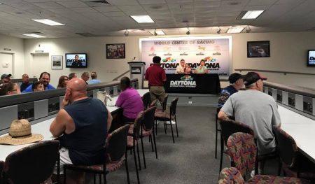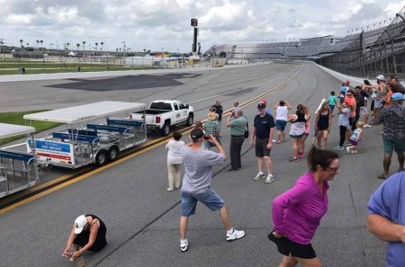 何の知識もなくデイトナに着くとツアーをやっている。コースだけ回る30分コース/18ドルと、降りての見学もある90分/25ドルのコースの2本立て。初めてなのでフルコースを。平日なのに下のトレーラーが満員状態。最初にコース見物から。写真の通りユルい感じです。