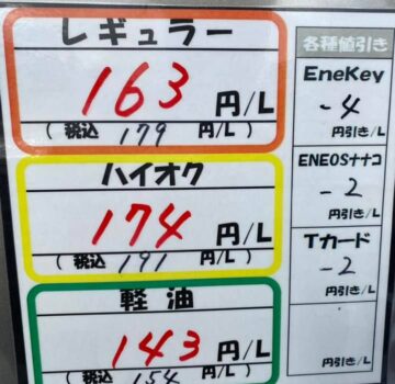 上の写真を見ていただけば解る通り、ガソリン価格って幅がある(レギュラー163円って書いてあるけれど内税表示!)。消費税込み価格で179円。そこからエネキー使えば4円安。ナナコやTカード使い2円安。「エネキーやナナコだとガソリンの仕切り価格まで安くなる」ということじゃないだろうから、ガソリン価格にはけっこうなバッファがあるんだと思う。どうなっているのかワカラン!