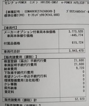 セレナeパワー44万5774円引き! この見積もりはメーカーオプションのナビなどを含んでいるため少し大きい金額になっているかもいしれないが、それでも魅力的なオファーだ。日産の場合、販売台数の少ない車種より、ノートやセレナ、エクストレイルといった主力車種の値引き激大! ノートeパワーなども25万円以上の条件が普通に出ているそうな。エクストレイルだって35万円超え~