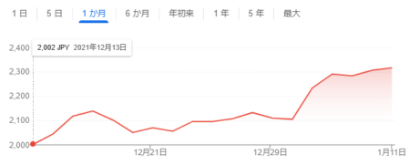 参考までに書いておくと当時、購入を勧めました。さらに興味深いのは、直近1ヶ月の値上がり具合。12月13日の2002円から、15.7%上がった2318円になっている。なぜこんな値上がりをしているのか? 調べてみたら、12月14日の「2030年に電気自動車を350万台作る」という発表によるモノらしい。この1ヶ月で日産も13%。ホンダ9.3%。マツダ10.1%上がってます。