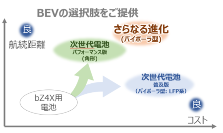 寒冷地や、クラウンのようなラージクラスの電気自動車用としては、もう少し容量の大きいニッケル系の正極を使ったバイポーラ構造のリチウムイオン電池を開発しており、リン酸鉄リチウムより少々高くなるものの、従来の三元系リチウムイオン電池を大幅に凌ぐ性能を持つそうな。このタイプの電池は高価格帯のクルマと寒冷地仕様に採用されると思う。どちらも2027年メドとのこと。