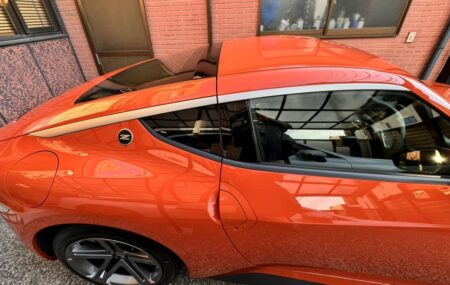 ルーフのメッキ部分も意味が分からないとのこと。私もフェアレディで唯一納得できない。何のアクセントにもなっていないし、むしろない方がシンプルでカッコ良い。もしかすると何らかの帳尻合わせなのかもしれません。屋根が黒のツートンなら気にならない? オレンジは一色でよかった。この2点を除き、しっかり磨いてコーティングすることで限りなく100点の塗装になります。