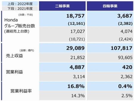 昨日のトヨタに続いてホンダが2022年度の決算発表を行った。驚いたのは四輪事業の厳しさ。何と営業利益420億円で、4887億円を稼いだ二輪部門の10分の1以下! 昨年度は二輪3114億円に対し四輪2362億円だったことを考えたら、なかなかの数字です。最近厳しく書いていた通りになってしまった。アメリカ以外は全て赤字ということ理解でいいと思う。