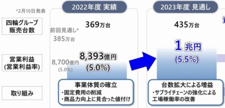 一番驚いたのは2023年度見通し! 2022年度369万台だった世界販売台数を、18%伸ばして435万台に増やすという。営業利益も8393億円から台数拡大による増益を見込んで1兆円にするという。日本市場を見ると2023年度に投入するのはZR-Vとオデッセイ、N-BOXくらい。米国も1180万台に増やし、中国は146万台! 逆に考えるとホンダにとって半導体不足が足かせになっている?