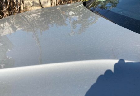 屋根のある駐車スペースが3台分しかないため、日頃乗るクルマは屋根無しの場所になりがち。ということでXC60も半分以上屋根無し。当然ながら汚れる。東京の空気は汚いし酸性の雨だって降る。その上、鳥爆弾多し! 下の写真、窓ガラスに3発。ボンネットに4発喰らってます。塗装にとっちゃ最悪と言って良かろう。及川さんのコーティング無しだとアカンす。