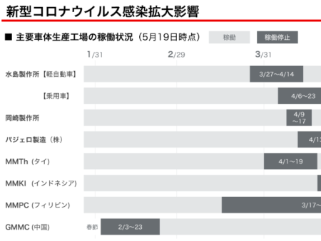 販売台数にして9%減ったという。しかし! 工場の稼働状況を見ると、最も早く稼働休止したフィリピンで3月17日から。当然ながら3月の販売台数に与える影響は限りなく小さかったと思う。また、一部メディアに「アセアンの成績が悪かった」という記事が出ていたけれど、タイの三菱自動車(子会社)から3月31日に611億円という配当を貰っている。