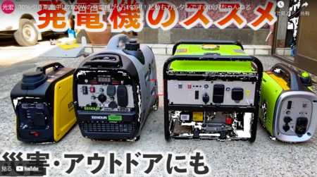 タイトルに書いた通り、4日の20時から30%引きセールをやっていて6万193円! コストパフォーマンス高いです。しかもコメント書けば保証が2年に伸びる! どんな音がするかは下の動画を御覧下さい。いずれにしろ自然災害に備え、1家&1事務所に1台発電機+ガソリン20Lくらいを常備しておくと緊急時に使えます。買ったら半年に1回くらいエンジン掛けて遊んでください。