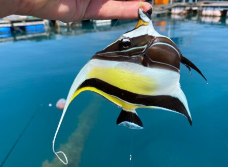 筏までは船外機付きの和船で10分ほど。同志を見回すとだ~れも釣れていない。やっぱし沖縄の筏、アカンな。全く期待せずオキアミを餌に釣り始めると、信じられいほど小さい幼魚しか釣れない。それでも辛抱して釣ってたらツノダシでやがんの! こやつ、超オチョボ口で釣れるなんて想像もしていなかった。沖縄の筏修行、相当厳しい!