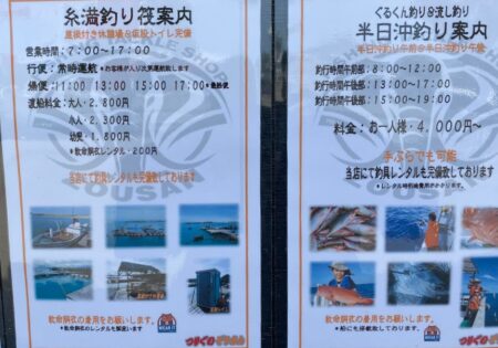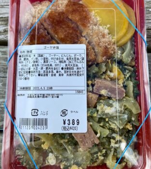 釣り道具屋さんがあったので釣りでもしようかと立ち寄ると、筏釣りがあるという。沖縄の筏釣り、悲しいかな釣れたこと無し! 夕方までヒマだからダメもとで試す。ちょうどお昼の時間だったためゴーヤ弁当。沖縄の弁当は200円台から。420円のゴーヤ弁当って高級品だ。沖縄、食べるものがリーズナブル。地元の人御用達のお店だと、どこも満足度高い。