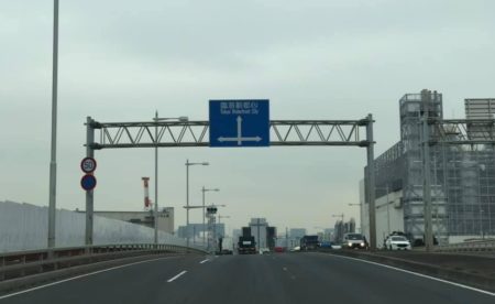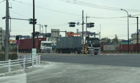 いつもなならトレーラー引っ張った左折トラックがズラリと並ぶ。はたまた中央防波堤埠頭から出てくる海上コンテナ積んだトレーラーは大渋滞。なのに本日は信号1回で左折出来るし、中央防波堤から出てくる海上コンテナも信号1回あたり2~3台。平日の昼とは思えない! 下の写真もいつもなら右折も左折も激しく渋滞します。明らかに海上コンテナの入荷量減ってる。