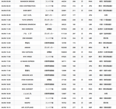下は4月6日(月)に東京湾へ入ってくる160m以上の大型船。東京や横浜といった大きなターミナルあるのにコンテナ船は9隻しかない。これを上から順番に追いかけてみる。『BANGKOK BRIDGE』をマリントラフィックで船名入れて追いかけると、シンガポールを3月29日の20時に出港し、ベトナムのホーチミンに31日の夜到着。そこから鶴見に向かう。中国やアメリカの物資無し。