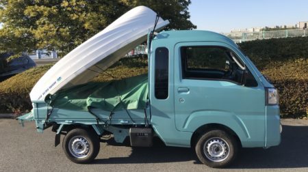 軽トラック、全高2500mm以下。長さは+10%まで荷物を積める。251cmのウォーカーベイなら余裕でした。オールで漕ぐのもいいけれど、クルマ好きたるモノやはりエンヂンなくちゃアカン! 2馬力までは船検無しで積める。ということで海を汚さない4スト2馬力船外機(最軽量のホンダ。13,6kgです)を組み合わせてみた。これまた法的な問題はありません。