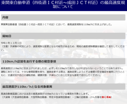 千葉県警は12月1日から東京から成田空港間で使う東関道の四街道~成田JCT間の制限速度を110km/hに引き上げた。1年程度事故の状況など見た上、120km/h化するとのこと。今まで110km/hから120km/hになっていない高速道路は無いため、来年末から120km/hとなるだろう。千葉県警の判断を素直に歓迎したい。新東名の120km/h区間を走ると、日本人の高速マナー向上になっている。