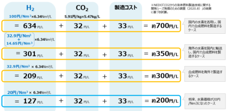 合成燃料は水素と二酸化炭素から作られる。ガソリンの主成分も炭化水素で、炭素と水素からなる。大量生産した時の製造コストは案外安く、リッターあたり33円を見込む。二酸化炭素も安く作れるため、リッターあたり32円。一番高価なのが水素となり、現時点で目標となっている水素価格を持ってしてもリッター700円になる(直近の合成燃料はその2倍以上だと思われます)。
