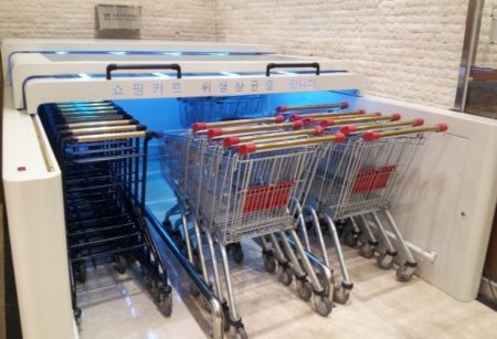 吊り輪を回転させると殺菌。ショッピングカートも殺菌。日本、圧倒的に出遅れた!