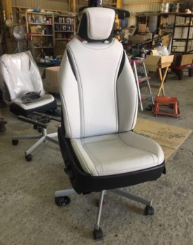 ということでMIRAIのシートだ。私のMIRAI、純正シートに座ったのは永田だけ。しかも練馬からいすみまでしか使っていない。新品です。加えてMIRAIのシートはトヨタ車の中でもコスト掛かってる。加えて田中さんが「思い切りやったれ!」ということなんだろう。オシャレなホワイト。後ろにもう1脚見えますね~。コレは喜多見さん用か。果たして座り心地やいかに?
