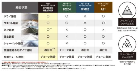 しかしダンロップは昨年「画期的なタイヤを開発しており来年発売」と発表。そのタイヤがついにデビューです。『シンクロウェザー』とネーミングされた新タイヤの適合表が上。氷上性能も1世代前となる『WN02』(ウインターマックス02)の性能を100とすれば、102にまで迫るという。ちなみに最新タイプの『WN03』は競合メーカーの新世代タイヤと同等。