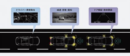 意識を失ってから車線をキープする機能までは同じ。その後、ハンドル操作がなければ、警告灯や警告音だけでなくクラクションまで鳴らす。そしてハザード点灯し、自動停止後、コールセンターへ自動通報。運転者に「何かありましたでしょうか?」と質問してくれる。全く応答無ければ、すぐ緊急通報などの対応も可能。