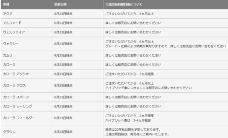私は今年3月にノアを契約し、納期来年春になるようだ。おそらくノアも遠からず「ディーラーで相談」になる。そうなれば値上げした新価格で契約しなければならないだろう。10万円くらいの値上げを覚悟しておいた方がいい。今契約すれば現在の価格だし、今乗っているクルマは1年後に手放しても現在と同じくらいの買い取り価格をキープ出来ると思う。お得だ!