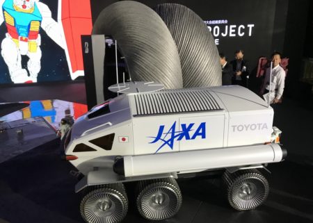 と思っていたら、月面を走るためトヨタが開発してる燃料電池ローバーのタイヤを展示してある。ブリヂストン製だ。表面は繊維状ながら、金属素材だという。圧倒的なホンモノ感を出しており猛烈な存在感あります。また、eモータースポーツと同じ展示ブースにロボットのバスケットボール選手が。けっこうな距離からシュート打ち、全て入る! 凄い技術だ!