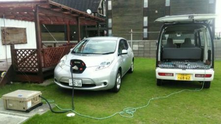 木舩さんから「皆さんに電気を使って貰おうと思った」という連絡を貰い「なるほど!」と思った次第。人数の多くない集落なら、1台のリーフで100人単位のスマホを充電出来ることだろう。千葉の台風被害はスマホ充電が出来ない人達も数多くいたようだけど、情報伝達の早い集落なら困らないで済みます。ちなみに暴風吹いてる最中はいかんともしがたいですね。