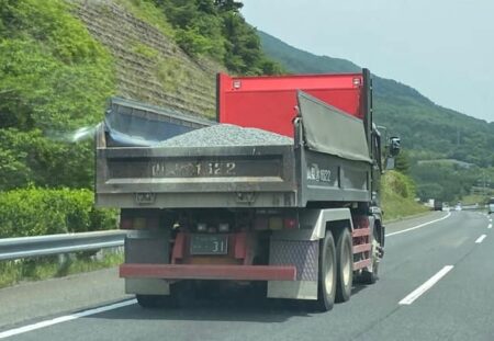 実際、写真を撮った場所から5kmくらい手前で走行車線を走っていたら「ビシッ!」と飛び石を喰らった。この積み方、どう考えたって違法。なぜ警察が見逃すのか不思議でならない。窓ガラス業界からマージン貰っているとしか思えないのだった。警察からしてみても小石なら人命に関わる事故になることはないから、窓ガラス業者の言うことを聞いているのかも(繰り返すが妄想です)。