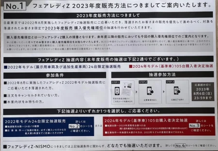 完全に買う気が無くなり放置状態だったフェアレディZながら、買うことになりました。なぜか? 理由は3つ。まず納期。何度も書いてきた通りフェアレディZの納期に対する日産東京のフォローは最悪だった。突如抽選になって「爺さんはずれ~!」。文句言うと「最初の1年分の抽選です」。そうこうしているうち「2023年納車の抽選をやります」。これまた「はずれ~」。