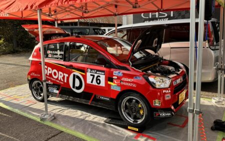 私のミライース、ハイランドマスターズ戦までに完成出来ませんでした。改造申請など出さなければならないのだけれど、認可まで2~3週間掛かる。間に合うかな、と思ったもののダメでした。ダイハツの相原さんが「だったら私のクルマを使いますか?」。全く同じスペックということもあり、大いに有り難い。しかも8月にK4GPで乗っている。私のミライースは来週完成です。