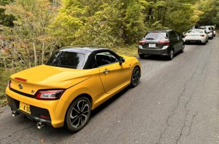 今回コ・ドラさんのマイカー(GRコペン)でレッキした。ナニを隠そうコペンでワインディングロードをしっかり走ったことがなかった。驚くことにコーナリングスピード速いのね! ECUとマフラーを交換してあるということで(合法)、いい音を出す。「ご予算半額以下で参戦出来る」という軽い気持ちで始めた軽自動車修行ながら、いわゆる”沼”に入り込みつつある。
