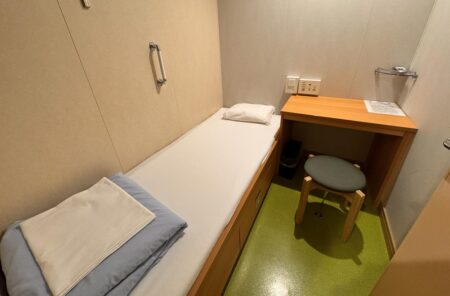 「ツーリストS」という7000円高いクラスを選んだのだけれど、まぁ狭い! 窓も無し。拘置所に入ったことはないが、こんなモンか? 壁は薄い樹脂1枚なので、隣の気配が伝わってくる。帰りは追加料金無しの解放ベッドにしようと思う。横須賀を23時45分に出ると北九州は翌日の21時着! 信号の無い海を休まず50km/hで走り続けるだけに速い! 大きいから揺れも少ないし。