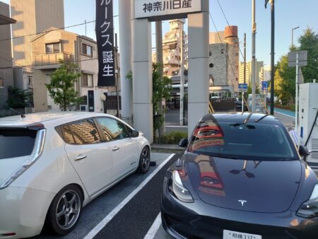 このままだと必ずや急速充電器の利用者同士の殺人事件が起きます(本気!)。すでに電気自動車の急速充電器を巡る環境はイラつくこと多数! 典型例が「充電終わってるのに放置」である。下は知人のケース。神奈川の日産ディーラーで急速充電しようとしたら、テスラがいる。ここまでは問題無し。日産ディーラーであってもお金払えばどのメーカーのクルマも利用可能。