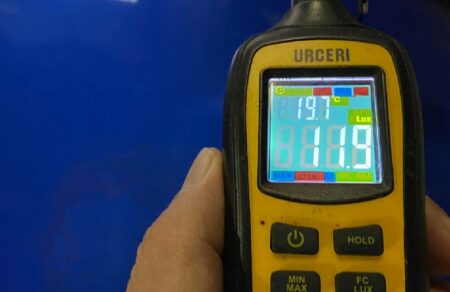 ということで向かって左がLED。右、蛍光灯です。写真だとあまり変わらない感じ。なぜかといえば右にアイリスが合っているからだと思う。ただニンゲンの目で見るとぜ~んぜん違います。奥の”梁”の明るさを見たらずいぶん違うと解ってくれるんじゃなかろうか。ということでヘッドライトの試験用に持ってる照度計を使いチェックしてみることにした。