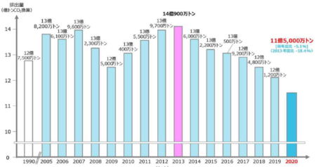 今までの日本の二酸化炭素排出量についての国際公約は「2030年に2013年比46%減」だった。削減目標を出すには分母大きい方がハードル低くなります。2013年と言えば東日本大震災から復興しつつあり、大量のエネルギーを消費していた。しかも原発は止まっていたため全て化石燃料。太陽光発電などの再生可能エネルギーも立ち上がっておらず。