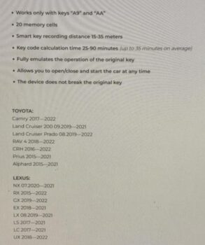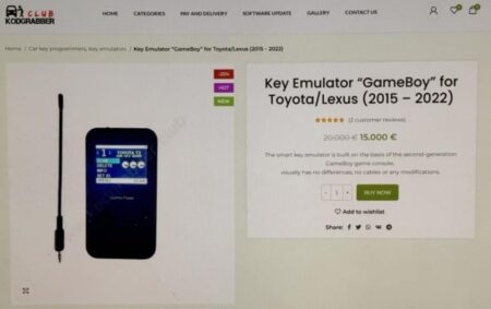 ゲームボーイと呼ばれる通り、大きさはゲームボーイくらい。上の”売りモノ”は2015~2022年式のトヨタ/レクサス用で、詳細な使用可能車種は下に出ている。価格は2万ユーロだったのが、大幅値引きして1万5千ユーロ(255万円)。使い方は簡単に見える。キー・エミュレーターを持ってクルマに近づき、ドアノブを操作。すると車両からスマートキーに対する電波が出るのでそいつを拾う。で、25~90分すると解析してキー代わりになるという。