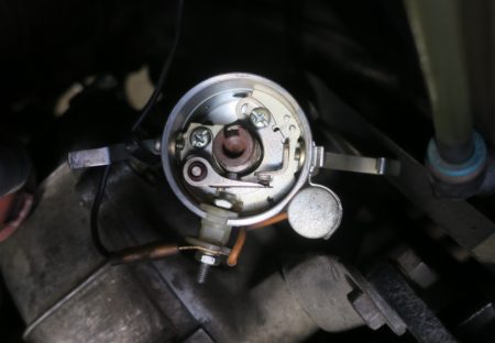 カバーを取ると下のようになっている。右斜め下が接点。真ん中の棒はカムになっており、回ると下のレバー押して接点を付けたり離したりします。サービスマニュアルでチェックしてみたら、少し広め(0,5mmくらい)が調子良いという。接点のコンディションについちゃ良好! 気持ち狭い感じなので、ネジ2本緩めて指示通り0,5mmくらいにセットしておく。
