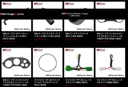 GRヘリテージパーツというラインアップです! すでに楽天でネットショップを開設しており、アクセスしたらこ~んなパーツが出てくる! 86のヘッドライトやドライブシャフト、スープラのメーターパネルやターボ関係のホース類など、徐々に部品数を増やしている。しかも復刻! 価格だって高くない。トヨタ、ついにここまで来ちゃった。スゴイを通り越して偉い!