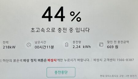 今日はヒョンデのMEGA WEBみたいな施設に行き、急速充電器を見せて貰った。驚くべきことに220kW前後という強烈なイキオイで入っていく! 基本は1セット18分になっており10%から80%まで入るという。基準は50kW入るらしい。チャデモ最速で70kW。30分で30kW入れば御の字だ。価格は6km走る分くらいの電力に相応する1kWhあたり30円とのこと。100円で20km走れる計算。